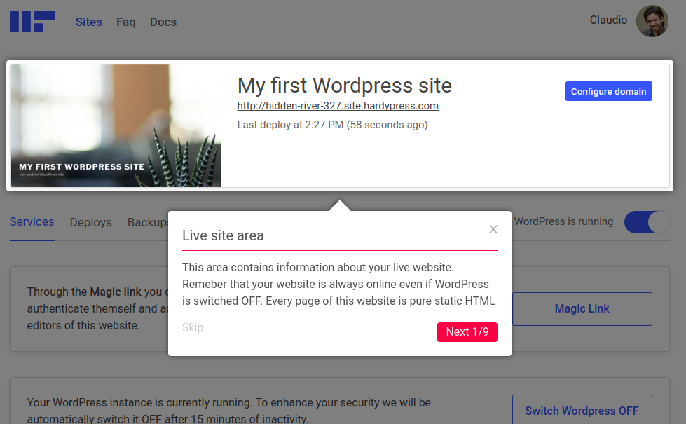 You can bring your WordPress to life or to put it to sleep with just a click. When it is turned on your WordPress is reachable through an HardyPress subdomain, something like: https://xxxxxxxxxxx-admin.hardypress.com. When it is turned off it simply doesn’t exists (no DB, no PHP, nothing at all), so you can sleep well at night.