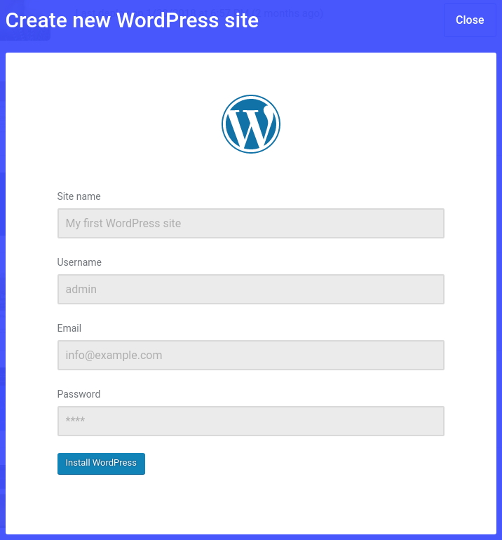 Once you log-in click “Create new site”. You will be asked to enter a site name (feel free to choose whatever you like), and the credentials for the admin user on your new WordPress site. We will install the last WordPress version available.