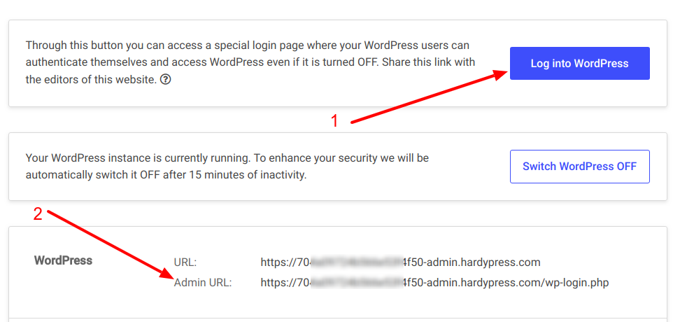 As your WordPress will be switched off most of the time, this page is always reachable on the wp-admin.hardypress.com subdomain and the URL will be something like this: