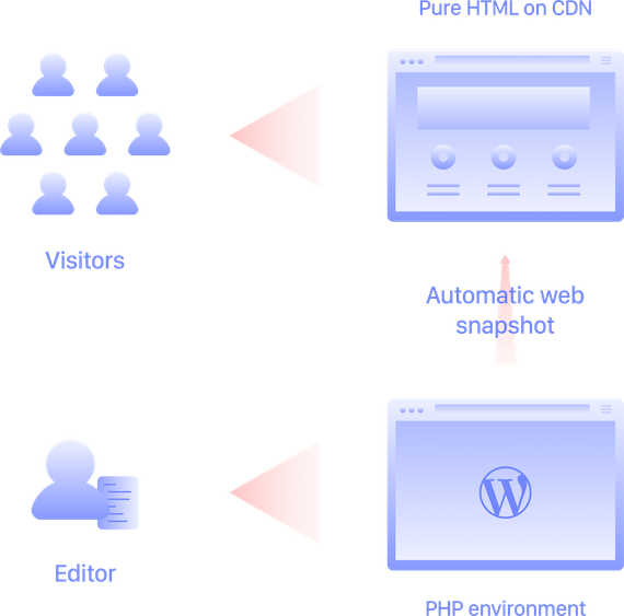 HardyPress hosts your WordPress installation securely and use it as a static site generator, so you can create an indestructible static site that we can serve separately from your WordPress installation. This provides a couple benefits. One, this allows you to keep WordPress in a secure location that no one can access but you. Two, your static site is going to be really, really fast.